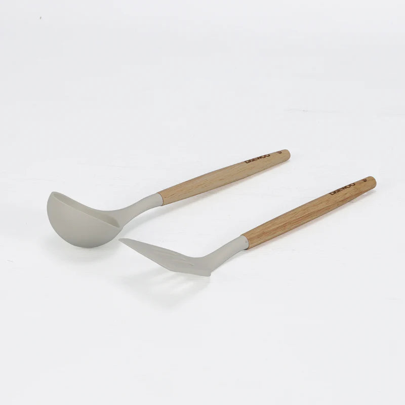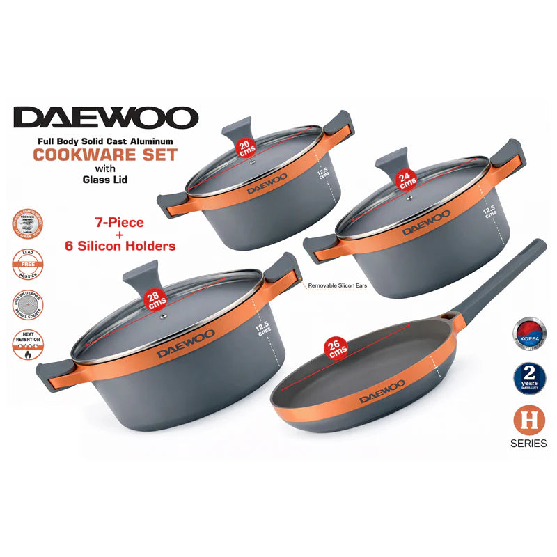 دايو طقم قدور جرانيت من سلسلة دايو H مكون من 9 قطع: قدر بأحجام 28، 24، 20 سم، ومقلاة بحجم 26 سم، بالإضافة إلى قطعتين من أدوات الطبخ
