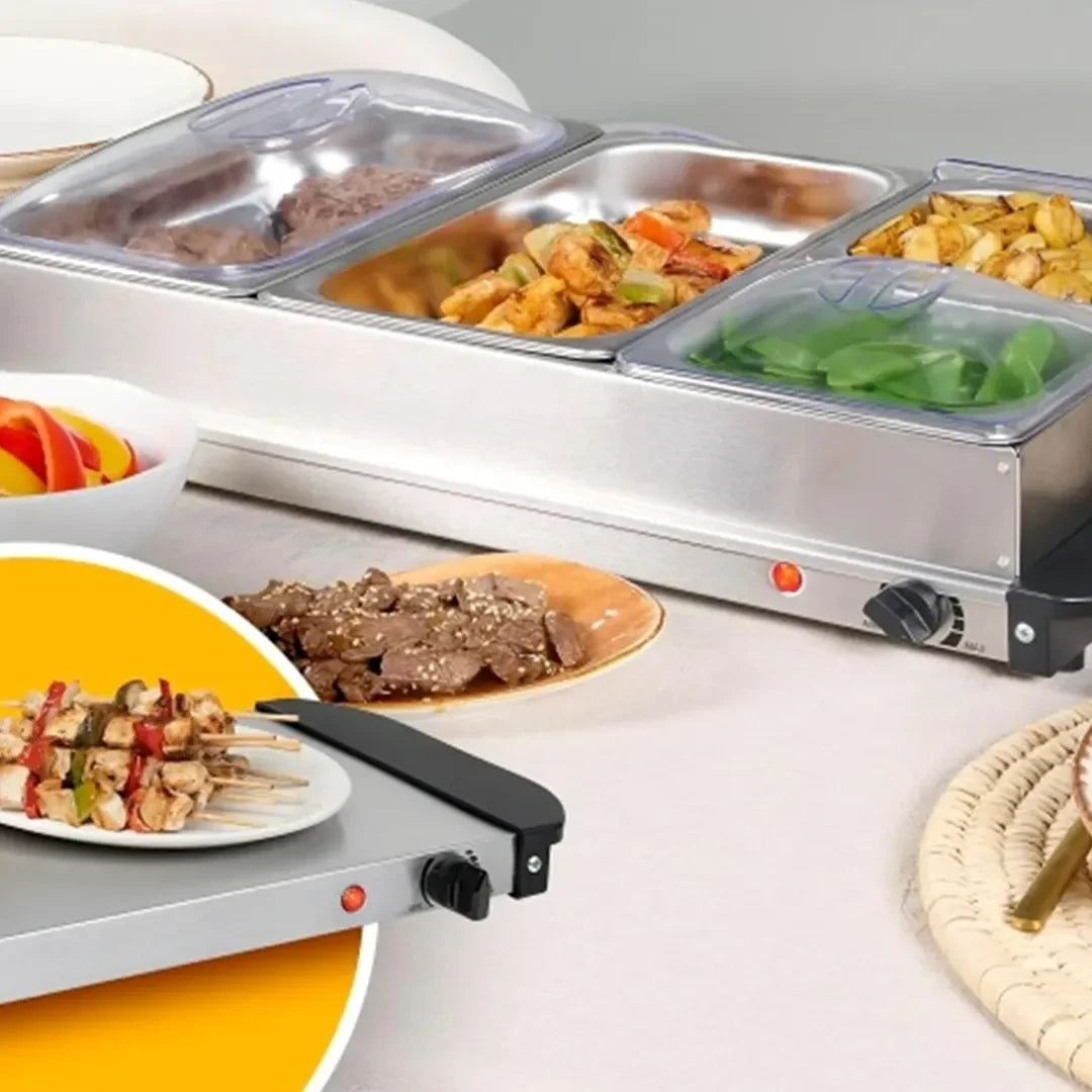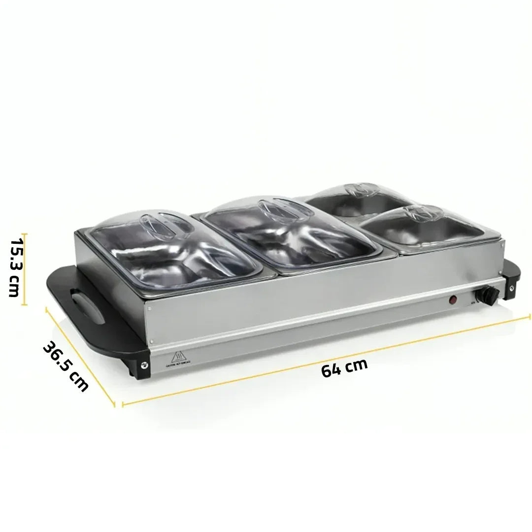 يتميز بوجود صينيتين واسعتين من الفولاذ المقاوم للصدأ بسعة 2.4 لتر وصينيتين بسعة 1 لتر، مثالية لتسخين أطباق متعددة في وقت واحد.