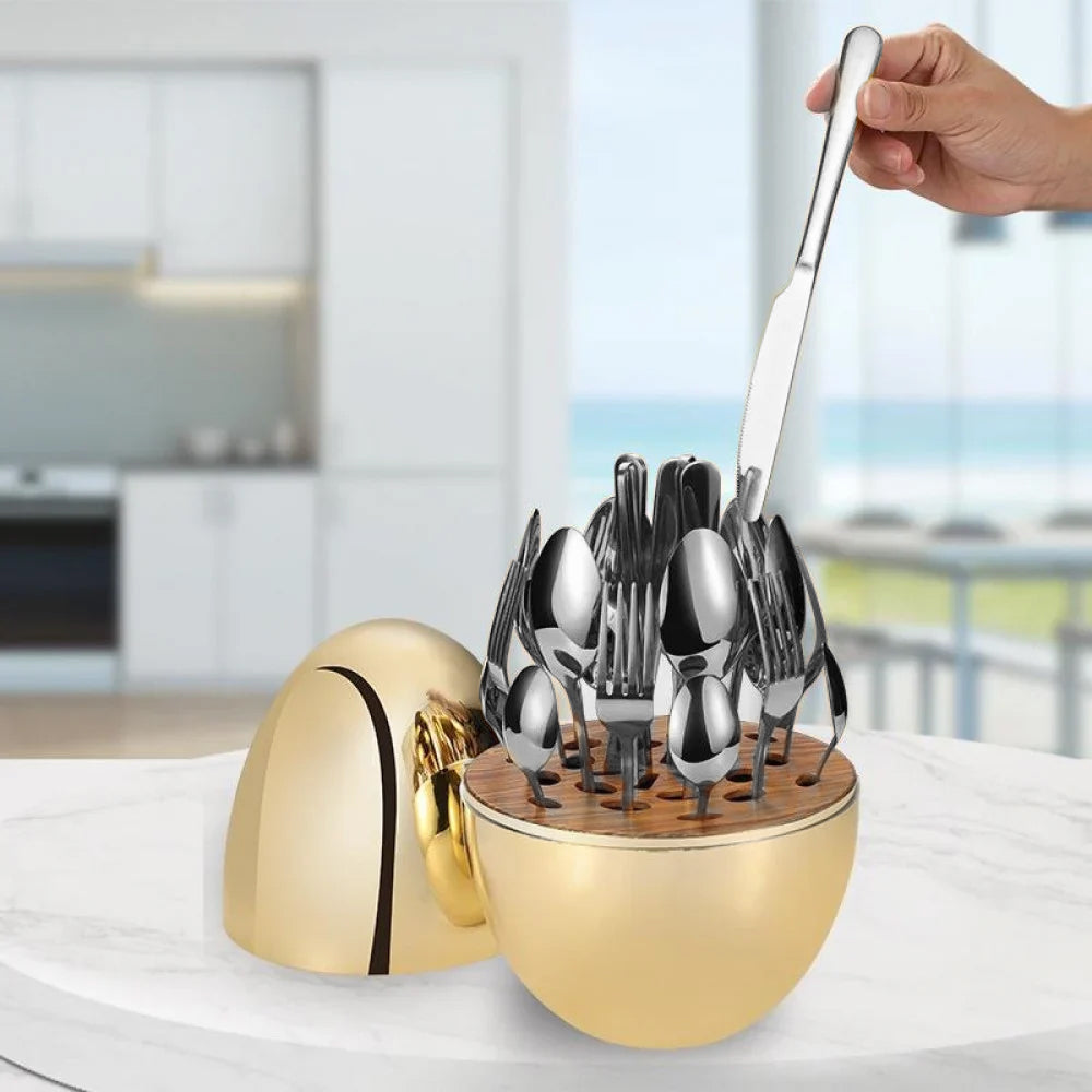 مجموعة أدوات مائدة فاخرة مكونة من 24 قطعة تتميز بتصميم أنيق على شكل بيضة مع تفاصيل ذهبية معقدة. هذه المجموعة هي الخيار المثالي لإضافة لمسة من الفخامة والأناقة إلى أي طاولة طعام. تشمل مجموعة متنوعة من الأدوات الأساسية مثل الملاعق والشوك والسكاكين والأكواب، مما يجعلها مثالية للمناسبات الرسمية والتجمعات الفاخرة.
