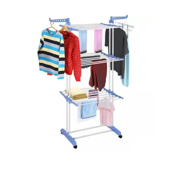 رف الملابس ثلاثي الطبقات مع عجلات سهل التجميع والتنظيف. إنه مستقر ودائم. إنه مثالي لتجفيف وتعليق الملابس في الداخل أو في الهواء الطلق.
