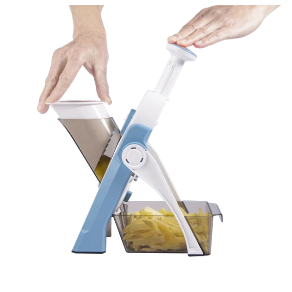 شفرات من الفولاذ المقاوم للصدأ عالية الجودة وقوية، والتي هي حادة جدًا، يمكنها قطع معظم أنواع الخضروات والفواكه بسهولة إلى الأشكال والأحجام المرغوبة.
